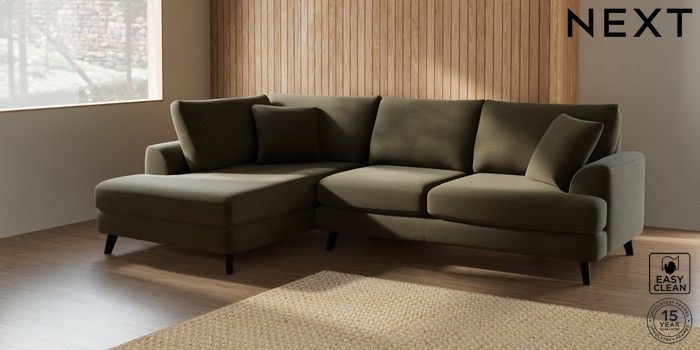 7.2.5 Buy Parker Medium Corner Chaise - Left Hand Fine Chenille Easy Clean Dark Moss Green Low Retro Tapered - Dark from the Laura Ashley online shop Click here to use our website with more accessibility support, for example screen readers