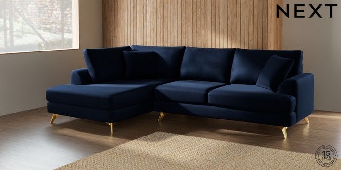 7.2.5 Buy Parker Medium Corner Chaise - Left Hand Luxe Chenille Navy Blue High Metal - Brass from the Laura Ashley online shop Click here to use our website with more accessibility support, for example screen readers