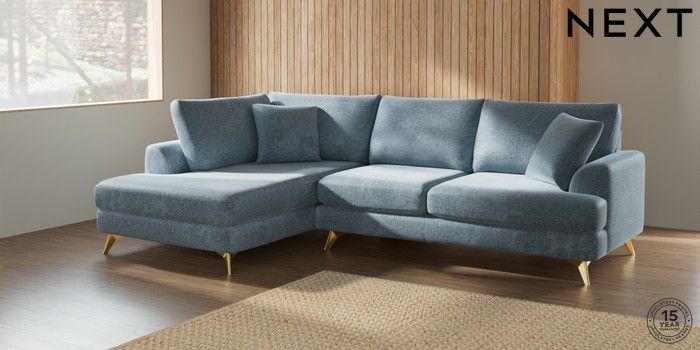 7.2.6 Buy Parker Medium Corner Chaise - Left Hand Plush Chenille Light Blue High Metal - Brass from the Laura Ashley online shop Click here to use our website with more accessibility support, for example screen readers