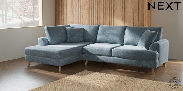 7.2.6 Buy Parker Medium Corner Chaise - Left Hand Plush Chenille Light Blue Low Retro Tapered - Light from the Laura Ashley online shop Click here to use our website with more accessibility support, for example screen readers
