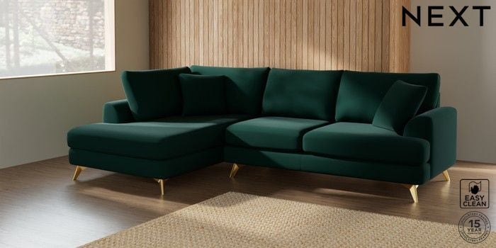 7.2.5 Buy Parker Medium Corner Chaise - Left Hand Plush Velvet Easy Clean Bottle Green High Metal - Brass from the Laura Ashley online shop Click here to use our website with more accessibility support, for example screen readers