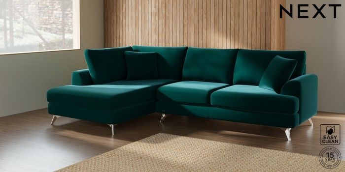 7.2.5 Buy Parker Medium Corner Chaise - Left Hand Plush Velvet Easy Clean Juniper Green High Metal - Chrome from the Laura Ashley online shop Click here to use our website with more accessibility support, for example screen readers