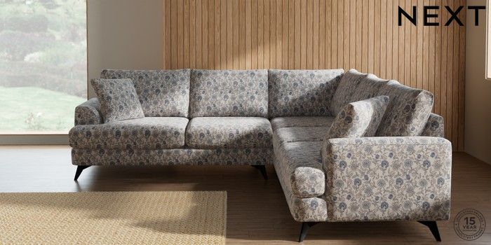 7.3.1 Buy Parker Medium Corner Sofa - Universal Relaxed Linen Look Print Woodblock Floral Blue High Metal - Black from the Laura Ashley online shop