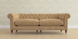 The Laura Ashley Penarth is a signature deep sit curved sofa in the Chesterfield style. Featuring gently scrolled, wide arms, matching the height of the back of the sofa, combined with deep seat cushions filled with foam core and fibre wrap interiors, this sofa is perfect for relaxing in. Elegant, tapered show wood legs with brass or chrome castors complete the traditional, classic style.