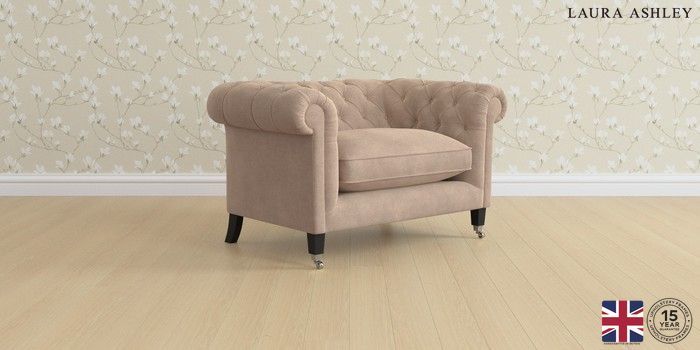 The Laura Ashley Penarth is a signature deep sit curved sofa in the Chesterfield style. Featuring gently scrolled, wide arms, matching the height of the back of the sofa, combined with deep seat cushions filled with foam core and fibre wrap interiors, this sofa is perfect for relaxing in. Elegant, tapered show wood legs with brass or chrome castors complete the traditional, classic style.