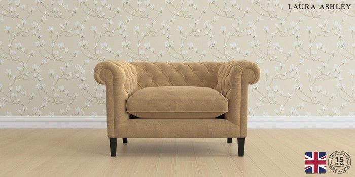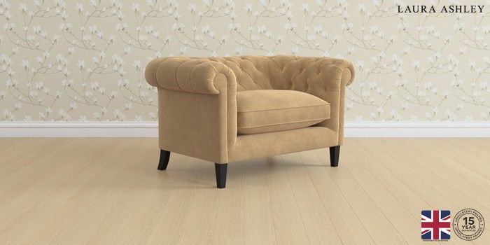 The Laura Ashley Penarth is a signature deep sit curved sofa in the Chesterfield style. Featuring gently scrolled, wide arms, matching the height of the back of the sofa, combined with deep seat cushions filled with foam core and fibre wrap interiors, this sofa is perfect for relaxing in. Elegant, tapered show wood legs with brass or chrome castors complete the traditional, classic style.