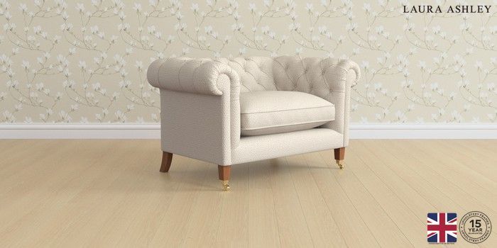 The Laura Ashley Penarth is a signature deep sit curved sofa in the Chesterfield style. Featuring gently scrolled, wide arms, matching the height of the back of the sofa, combined with deep seat cushions filled with foam core and fibre wrap interiors, this sofa is perfect for relaxing in. Elegant, tapered show wood legs with brass or chrome castors complete the traditional, classic style.