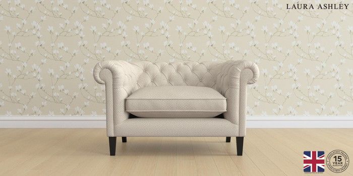 The Laura Ashley Penarth is a signature deep sit curved sofa in the Chesterfield style. Featuring gently scrolled, wide arms, matching the height of the back of the sofa, combined with deep seat cushions filled with foam core and fibre wrap interiors, this sofa is perfect for relaxing in. Elegant, tapered show wood legs with brass or chrome castors complete the traditional, classic style.