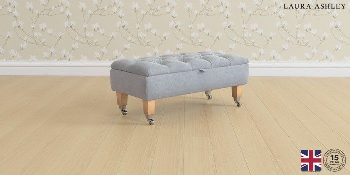 6.12.1 Buy Penarth by Laura Ashley Storage Footstool Peyton Powder Blue Straight Chrome Castor - Light Oak from the Laura Ashley online shop Click here to use our website with more accessibility support, for example screen readers