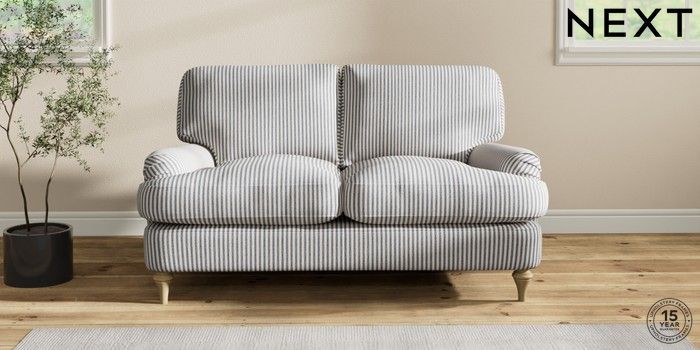 6.12.1 Buy Sadie Deep Relaxed Sit 2 Seater Small Sofa Chenille Stripe Slate Blue High Slim Turned - Light from the Laura Ashley online shop Click here to use our website with more accessibility support, for example screen readers