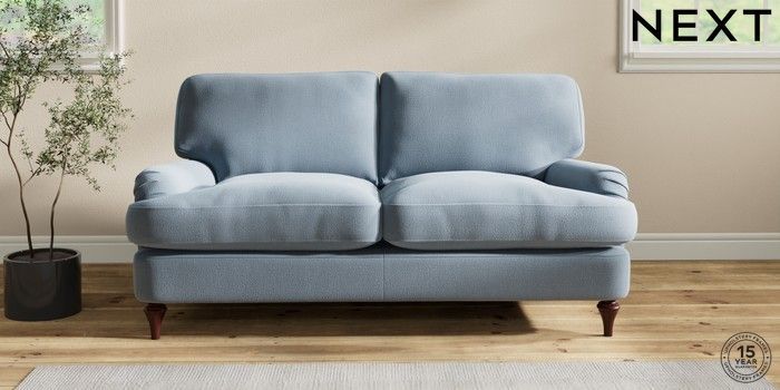 6.12.1 Buy Sadie Deep Relaxed Sit 2 Seater Sofa Relaxed Linen Look Mid Blue High Slim Turned - Dark Brown from the Laura Ashley online shop Click here to use our website with more accessibility support, for example screen readers