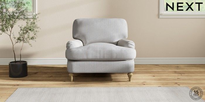 6.12.1 Buy Sadie Deep Relaxed Sit Armchair Chenille Stripe Slate Blue High Slim Turned - Light from the Laura Ashley online shop Click here to use our website with more accessibility support, for example screen readers