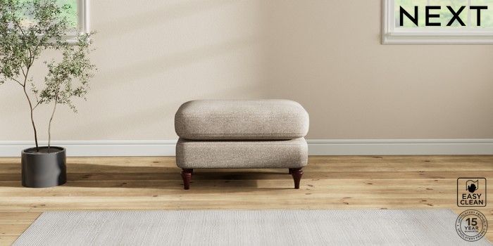 6.12.1 Buy Sadie Deep Relaxed Sit Footstool Chunky Boucle Easy Clean Mid Natural High Slim Turned - Dark Brown from the Laura Ashley online shop Click here to use our website with more accessibility support, for example screen readers