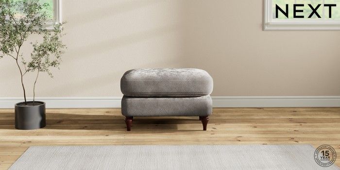 6.12.1 Buy Sadie Deep Relaxed Sit Footstool Distressed Velour French Grey High Slim Turned - Dark Brown from the Laura Ashley online shop Click here to use our website with more accessibility support, for example screen readers