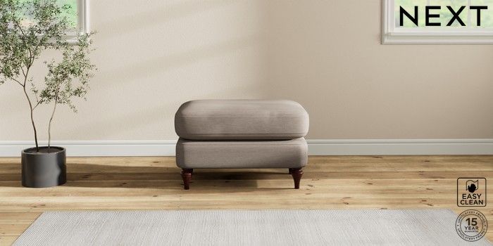 6.12.1 Buy Sadie Deep Relaxed Sit Footstool Fine Chenille Easy Clean Mid Taupe Brown High Slim Turned - Dark Brown from the Laura Ashley online shop Click here to use our website with more accessibility support, for example screen readers