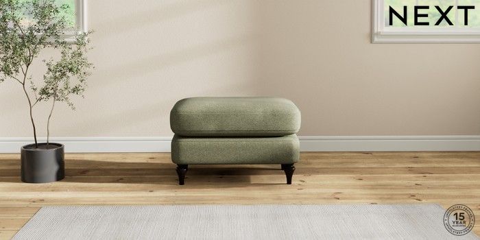 6.12.1 Buy Sadie Deep Relaxed Sit Footstool Tweedy Chenille Mid Moss Green High Slim Turned - Dark from the Laura Ashley online shop Click here to use our website with more accessibility support, for example screen readers