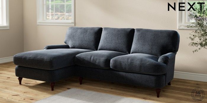 6.12.1 Buy Sadie Deep Relaxed Sit Medium Sofa Chaise - Left Hand Boucle Chenille Dark Slate Blue High Slim Turned - Dark Brown from the Laura Ashley online shop Click here to use our website with more accessibility support, for example screen readers