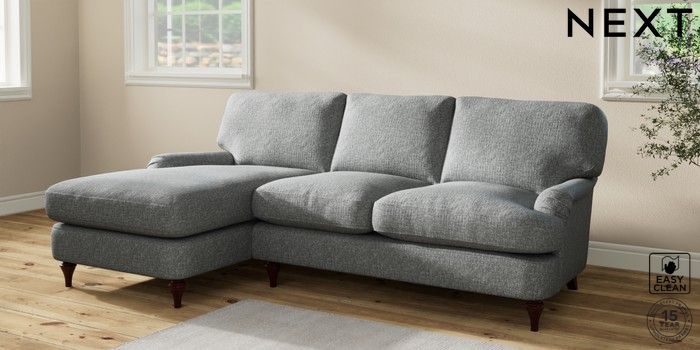 6.12.1 Buy Sadie Deep Relaxed Sit Medium Sofa Chaise - Left Hand Chunky Boucle Easy Clean Mid Grey High Slim Turned - Dark Brown from the Laura Ashley online shop Click here to use our website with more accessibility support, for example screen readers
