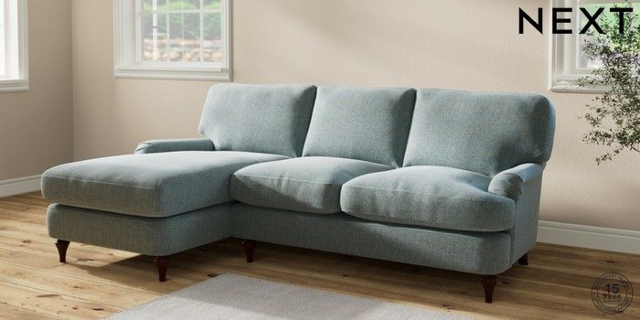 6.12.1 Buy Sadie Deep Relaxed Sit Medium Sofa Chaise - Left Hand Chunky Marl Mid Blue High Slim Turned - Dark Brown from the Laura Ashley online shop Click here to use our website with more accessibility support, for example screen readers