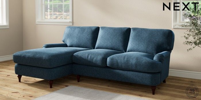 6.12.1 Buy Sadie Deep Relaxed Sit Medium Sofa Chaise - Left Hand Cotswold Chenille Dark Blue High Slim Turned - Dark Brown from the Laura Ashley online shop Click here to use our website with more accessibility support, for example screen readers