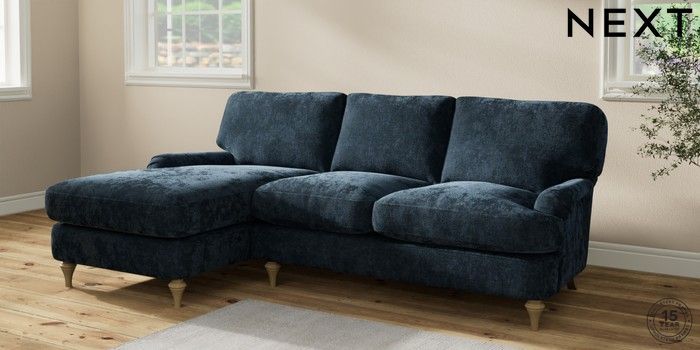 6.12.1 Buy Sadie Deep Relaxed Sit Medium Sofa Chaise - Left Hand Distressed Velour Midnight Blue High Slim Turned - Light from the Laura Ashley online shop Click here to use our website with more accessibility support, for example screen readers