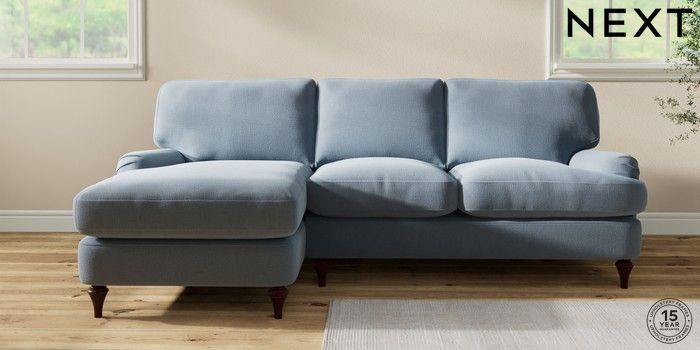 7.0.3 Buy Sadie Deep Relaxed Sit Medium Sofa Chaise - Left Hand Relaxed Linen Look Mid Blue High Slim Turned - Dark Brown from the Laura Ashley online shop Click here to use our website with more accessibility support, for example screen readers
