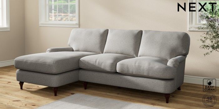 6.12.1 Buy Sadie Deep Relaxed Sit Medium Sofa Chaise - Left Hand Woven Chenille Easy Clean Light Grey High Slim Turned - Dark Brown from the Laura Ashley online shop Click here to use our website with more accessibility support, for example screen readers