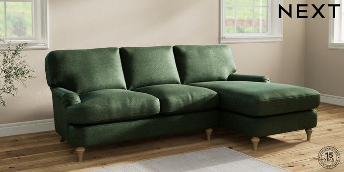 6.12.1 Buy Sadie Deep Relaxed Sit Medium Sofa Chaise - Right Hand Luxe Chenille Dark Green High Slim Turned - Light from the Laura Ashley online shop Click here to use our website with more accessibility support, for example screen readers
