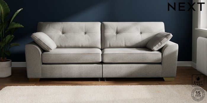 7.2.6 Buy Stamford Buttoned Back 4 Seater Sofa Woven Chenille Easy Clean Light Grey Large Square Angle - Brushed Brass from the Laura Ashley online shop Click here to use our website with more accessibility support, for example screen readers