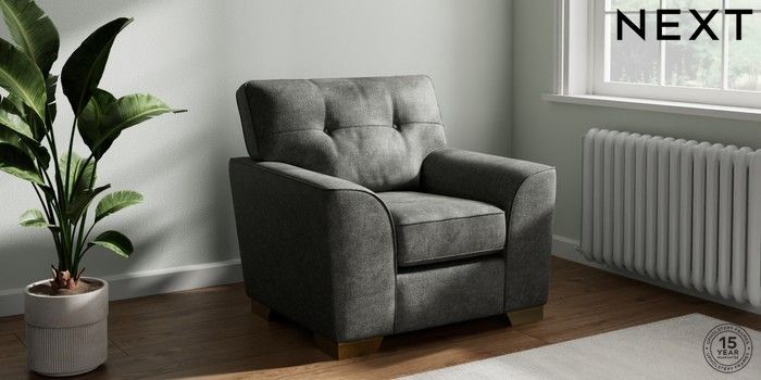 7.2.6 Buy Stamford Buttoned Back Armchair Plush Chenille Dark Grey Square Angle - Brushed Brass from the Laura Ashley online shop Click here to use our website with more accessibility support, for example screen readers