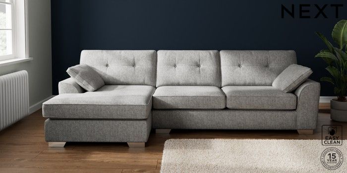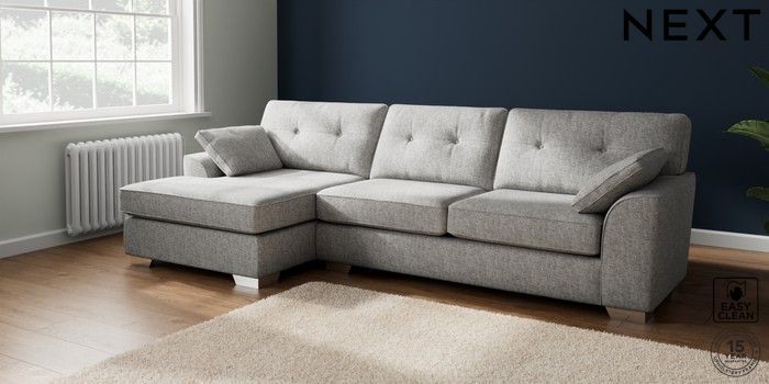 7.2.10 Buy Stamford Buttoned Back Large Sofa Chaise - Left Hand Chunky Boucle Easy Clean Light Grey Large Square Angle - Chrome Metal from the Laura Ashley online shop Click here to use our website with more accessibility support, for example screen readers