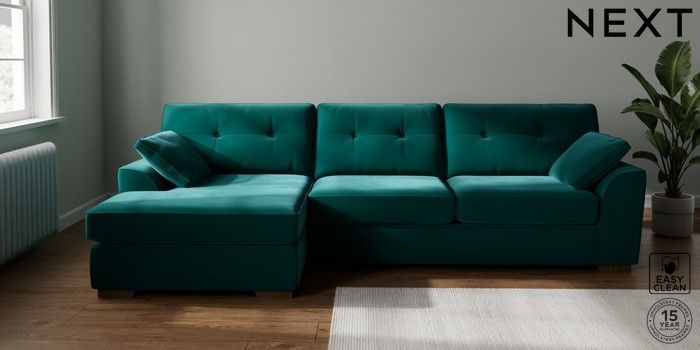 7.2.10 Buy Stamford Buttoned Back Large Sofa Chaise - Left Hand Plush Velvet Easy Clean Juniper Green Large Square Angle - Mid from the Laura Ashley online shop Click here to use our website with more accessibility support, for example screen readers