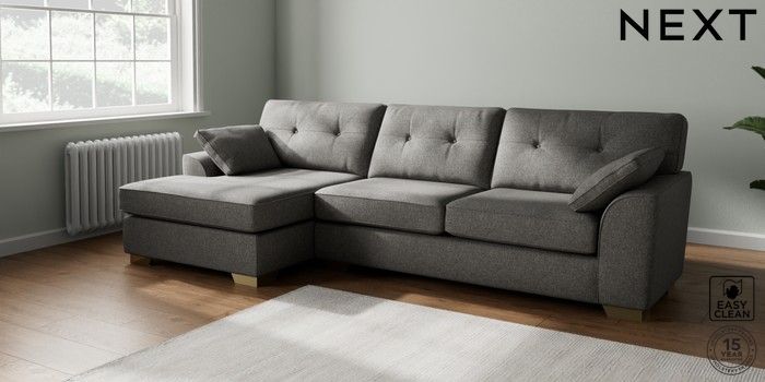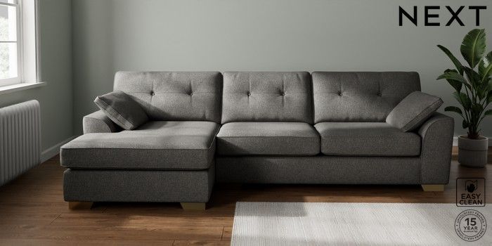 7.2.10 Buy Stamford Buttoned Back Large Sofa Chaise - Left Hand Tweedy Blend Easy Clean Dark Grey Large Square Angle - Brushed Brass from the Laura Ashley online shop Click here to use our website with more accessibility support, for example screen readers