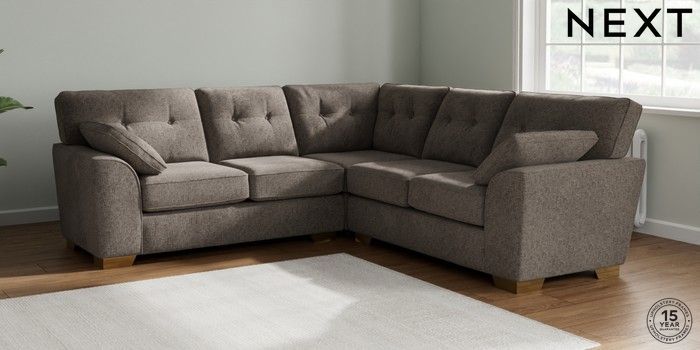 7.2.10 Buy Stamford Buttoned Back Medium Corner Sofa - Universal Chunky Chenille Mink Brown Large Square Angle - Brushed Brass from the Laura Ashley online shop Click here to use our website with more accessibility support, for example screen readers