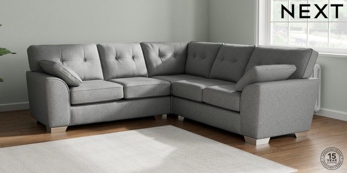 7.2.10 Buy Stamford Buttoned Back Medium Corner Sofa - Universal Chunky Weave Mid Grey Large Square Angle - Chrome Metal from the Laura Ashley online shop Click here to use our website with more accessibility support, for example screen readers