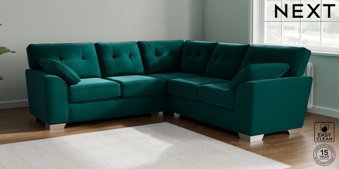 7.2.10 Buy Stamford Buttoned Back Medium Corner Sofa - Universal Plush Velvet Easy Clean Juniper Green Large Square Angle - Chrome Metal from the Laura Ashley online shop Click here to use our website with more accessibility support, for example screen readers