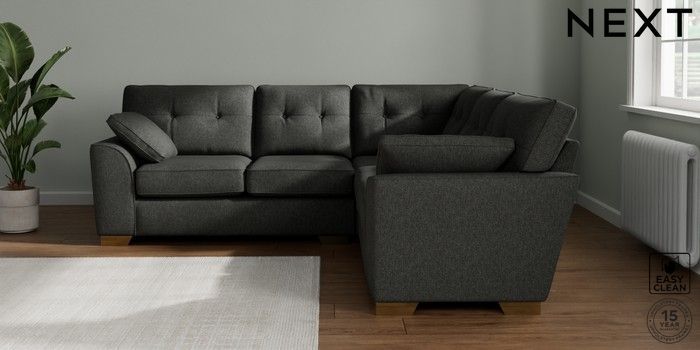 7.2.10 Buy Stamford Buttoned Back Medium Corner Sofa - Universal Tweedy Blend Easy Clean Charcoal Grey Large Square Angle - Brushed Brass from the Laura Ashley online shop Click here to use our website with more accessibility support, for example screen readers
