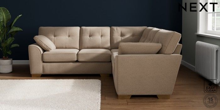 7.2.10 Buy Stamford Buttoned Back Medium Corner Sofa - Universal Tweedy Blend Easy Clean Light Dove Natural Large Square Angle - Brushed Brass from the Laura Ashley online shop Click here to use our website with more accessibility support, for example screen readers
