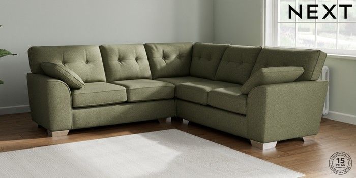 7.2.6 Buy Stamford Buttoned Back Medium Corner Sofa - Universal Tweedy Chenille Mid Moss Green Large Square Angle - Chrome Metal from the Laura Ashley online shop Click here to use our website with more accessibility support, for example screen readers