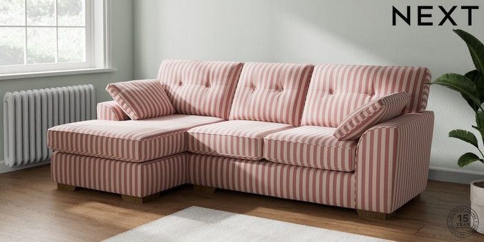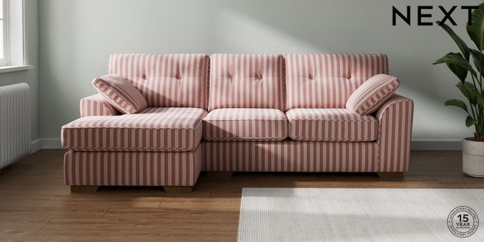 7.3.1 Buy Stamford Buttoned Back Medium Sofa Chaise - Left Hand Bold Chenille Stripe Dark Pink Large Square Angle - Mid from the Laura Ashley online shop Click here to use our website with more accessibility support, for example screen readers