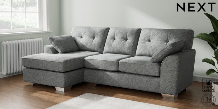 6.12.1 Buy Stamford Buttoned Back Medium Sofa Chaise - Left Hand Chunky Boucle Easy Clean Mid Grey Large Square Angle - Chrome Metal from the Laura Ashley online shop Click here to use our website with more accessibility support, for example screen readers