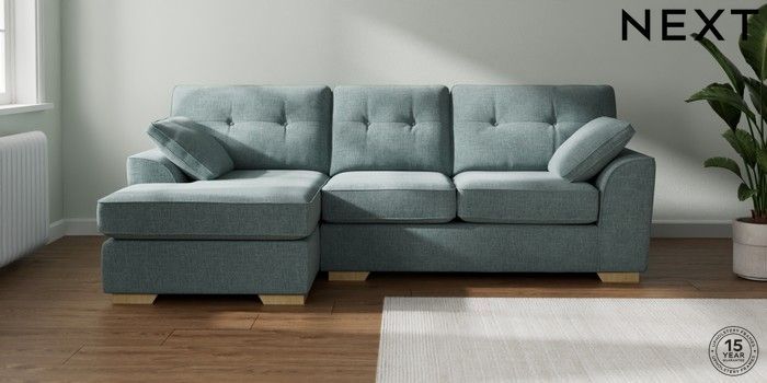 7.2.10 Buy Stamford Buttoned Back Medium Sofa Chaise - Left Hand Chunky Chenille Light Teal Green Large Square Angle - Light from the Laura Ashley online shop Click here to use our website with more accessibility support, for example screen readers