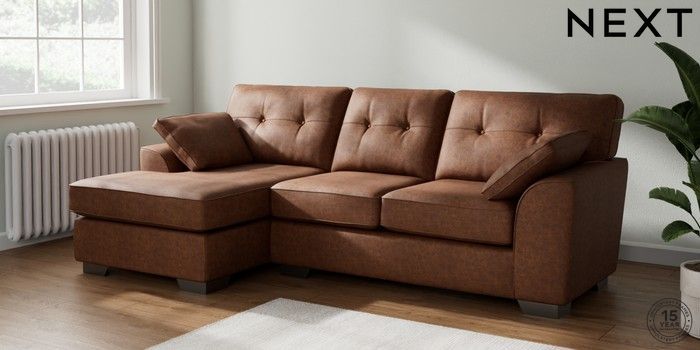 7.2.6 Buy Stamford Buttoned Back Medium Sofa Chaise - Left Hand Monza Faux Leather Easy Clean Chestnut Brown Large Square Angle - Gunmetal from the Laura Ashley online shop Click here to use our website with more accessibility support, for example screen readers