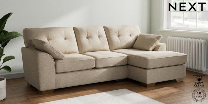 7.2.6 Buy Stamford Buttoned Back Medium Sofa Chaise - Right Hand Boucle Weave Easy Clean Dark Natural Large Square Angle - Brushed Brass from the Laura Ashley online shop Click here to use our website with more accessibility support, for example screen readers