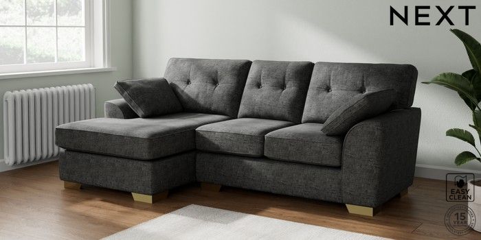 7.2.10 Buy Stamford Buttoned Back Small Sofa Chaise - Left Hand Boucle Weave Easy Clean Charcoal Grey Large Square Angle - Brushed Brass from the Laura Ashley online shop Click here to use our website with more accessibility support, for example screen readers