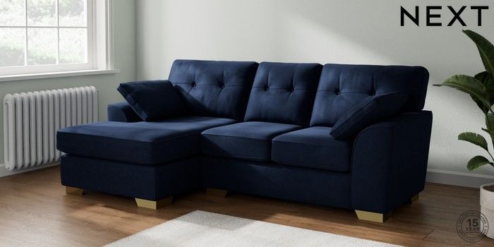 7.2.6 Buy Stamford Buttoned Back Small Sofa Chaise - Left Hand Luxe Chenille Navy Blue Large Square Angle - Brushed Brass from the Laura Ashley online shop Click here to use our website with more accessibility support, for example screen readers
