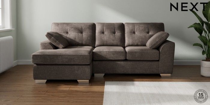 7.2.10 Buy Stamford Buttoned Back Small Sofa Chaise - Left Hand Plush Chenille Mink Brown Large Square Angle - Chrome Metal from the Laura Ashley online shop Click here to use our website with more accessibility support, for example screen readers