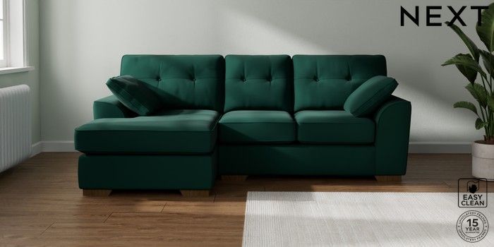 7.2.10 Buy Stamford Buttoned Back Small Sofa Chaise - Left Hand Plush Velvet Easy Clean Bottle Green Large Square Angle - Mid from the Laura Ashley online shop Click here to use our website with more accessibility support, for example screen readers