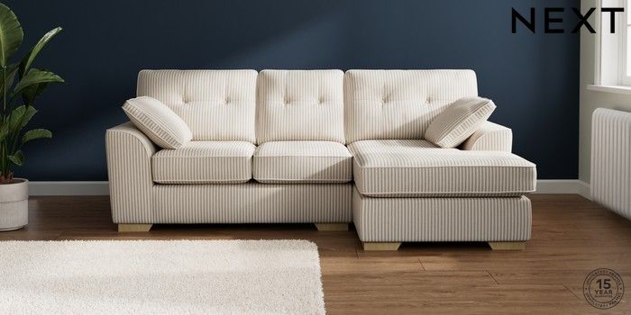 7.3.1 Buy Stamford Buttoned Back Small Sofa Chaise - Right Hand Chenille Stripe Natural Large Square Angle - Light from the Laura Ashley online shop Click here to use our website with more accessibility support, for example screen readers