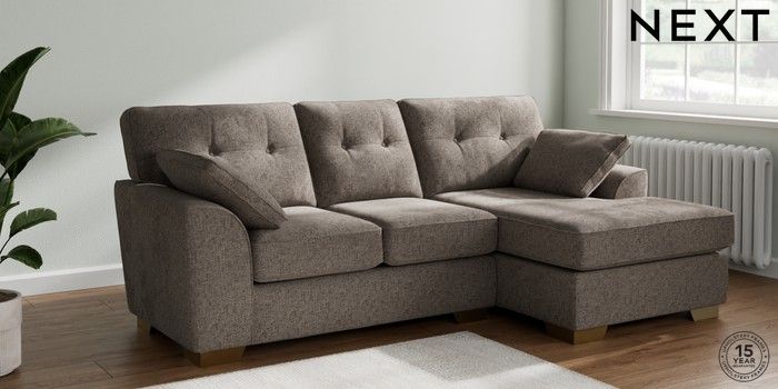 7.2.6 Buy Stamford Buttoned Back Small Sofa Chaise - Right Hand Chunky Chenille Mink Brown Large Square Angle - Brushed Brass from the Laura Ashley online shop Click here to use our website with more accessibility support, for example screen readers